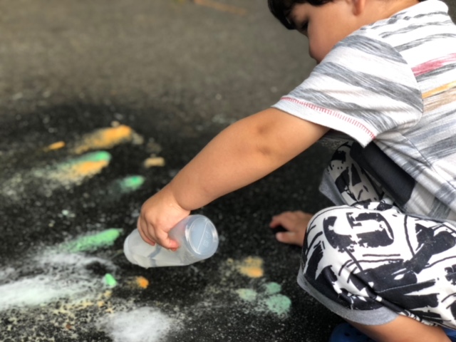 When the kids are done painting. Hand them a squeeze bottle filled with vinegar. This is where they get really excited! When you squirt the ice chalk with vinegar the cubes start to erupt! My boys loved to hear the sound of the fizzing.
