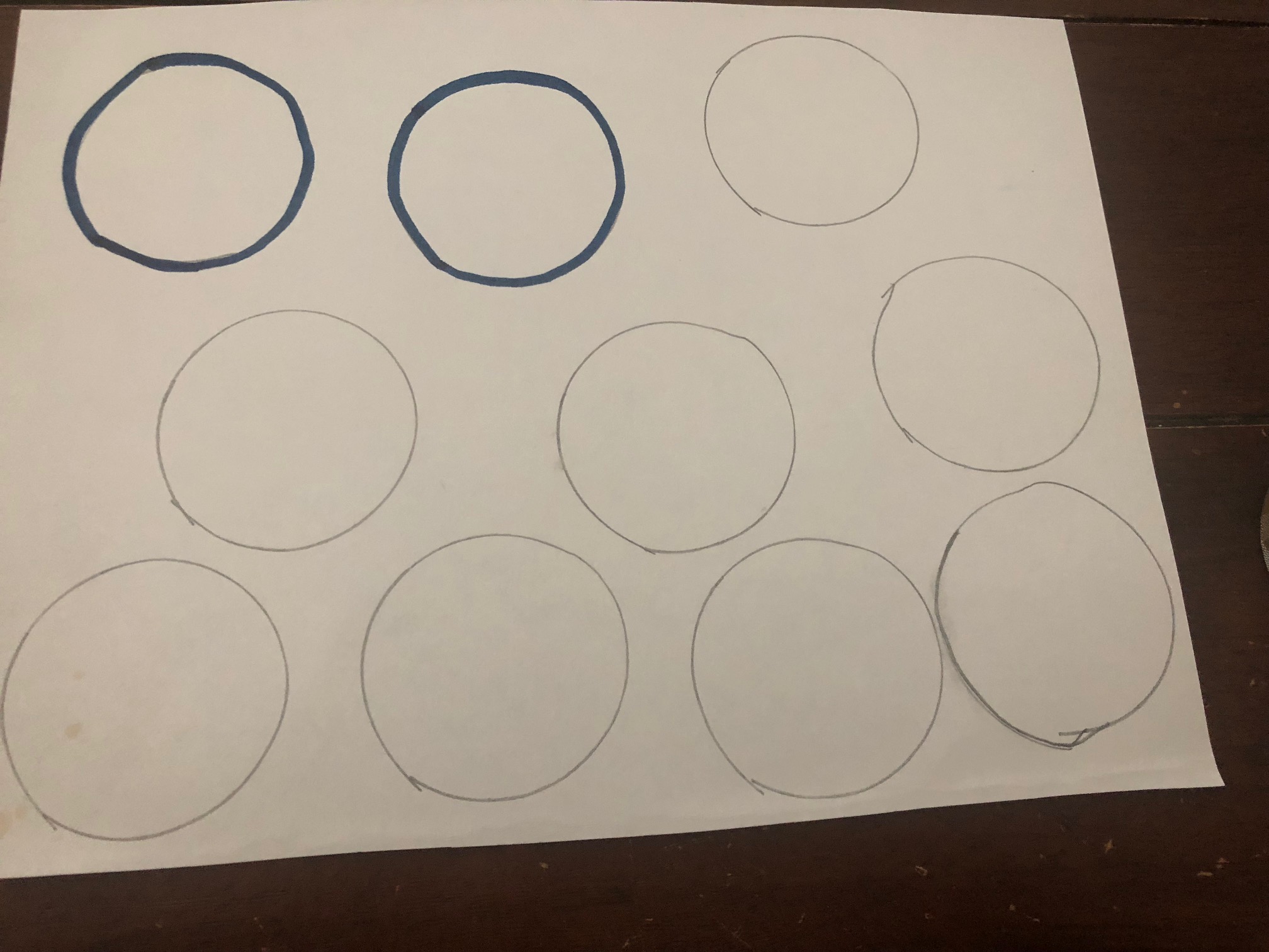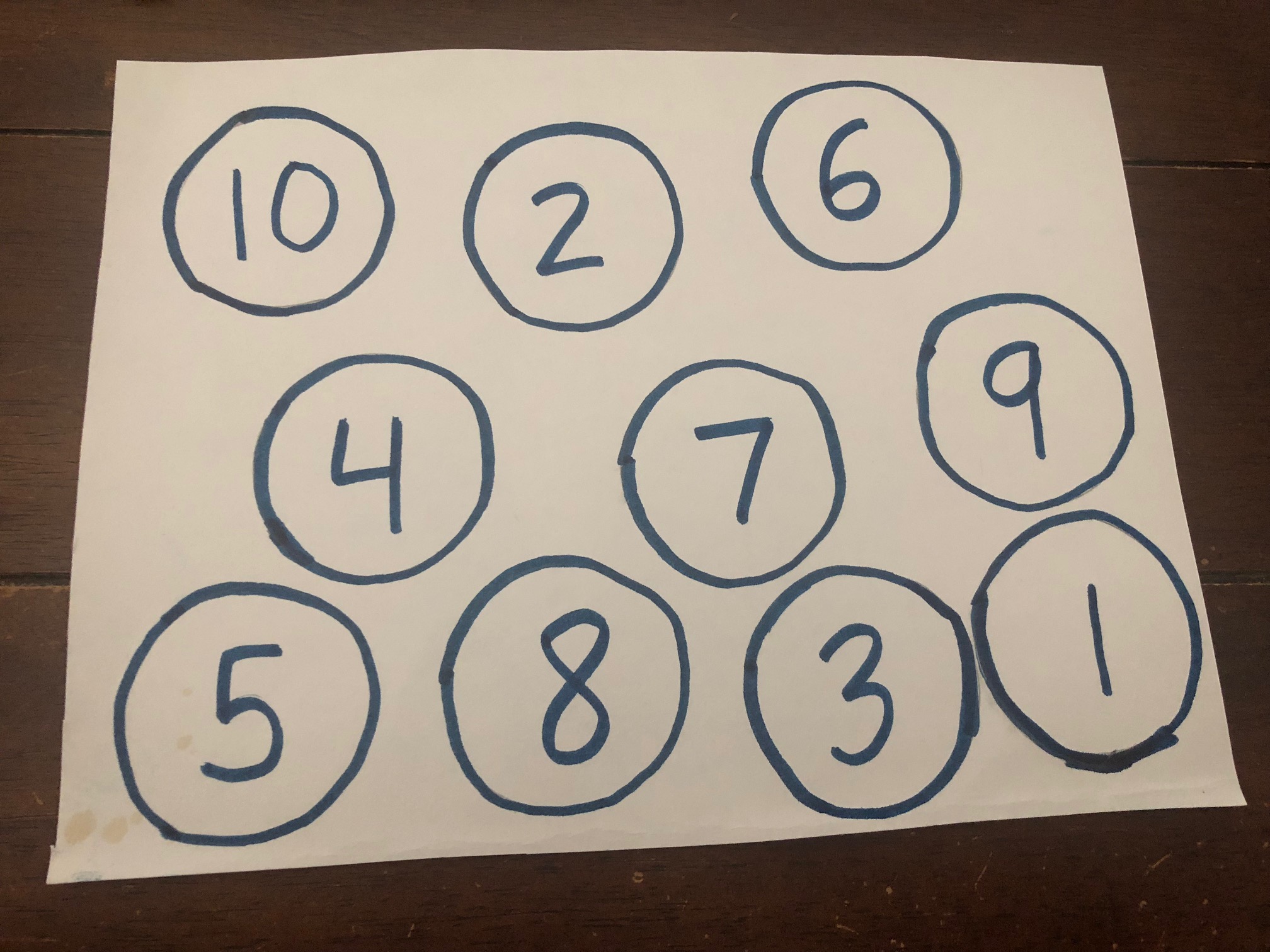 First find a circle lid to trace. Then trace 10 circles onto a piece of paper. I traced with a pencil and then went over the pencil with marker. Next write numbers 1-10 in the circles.
