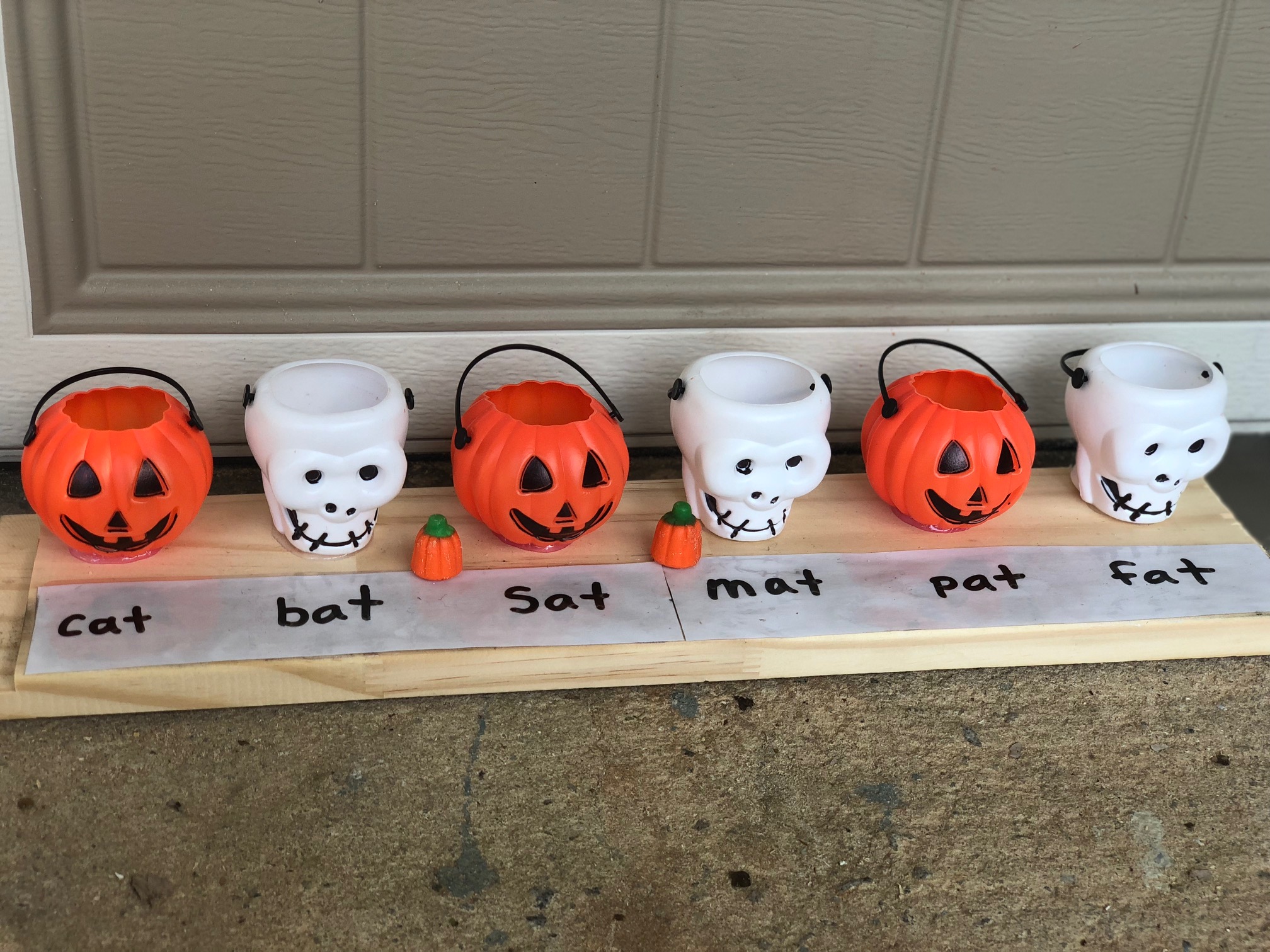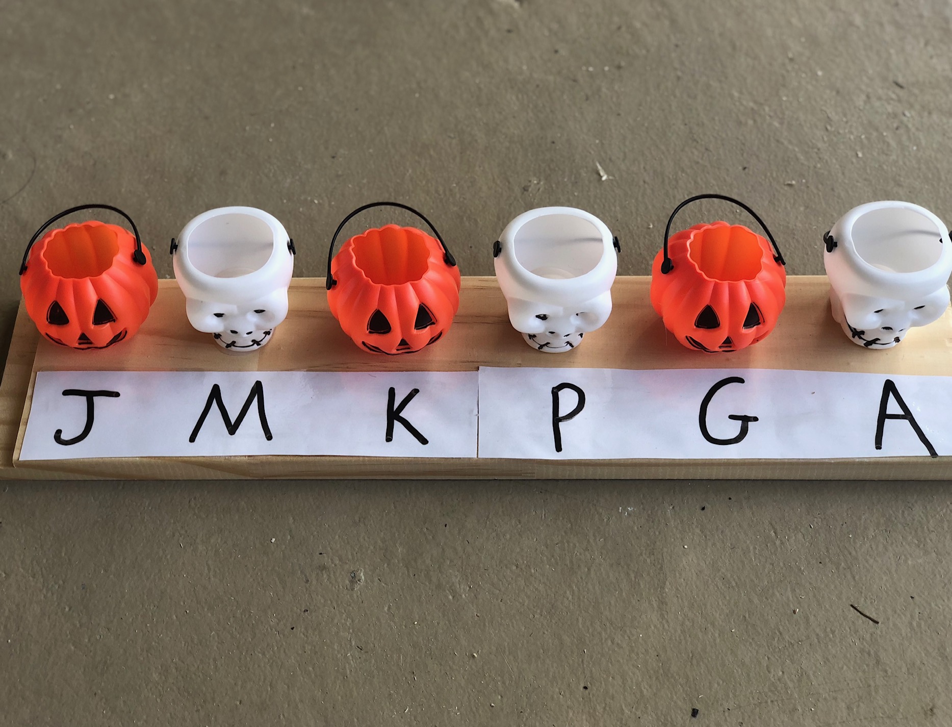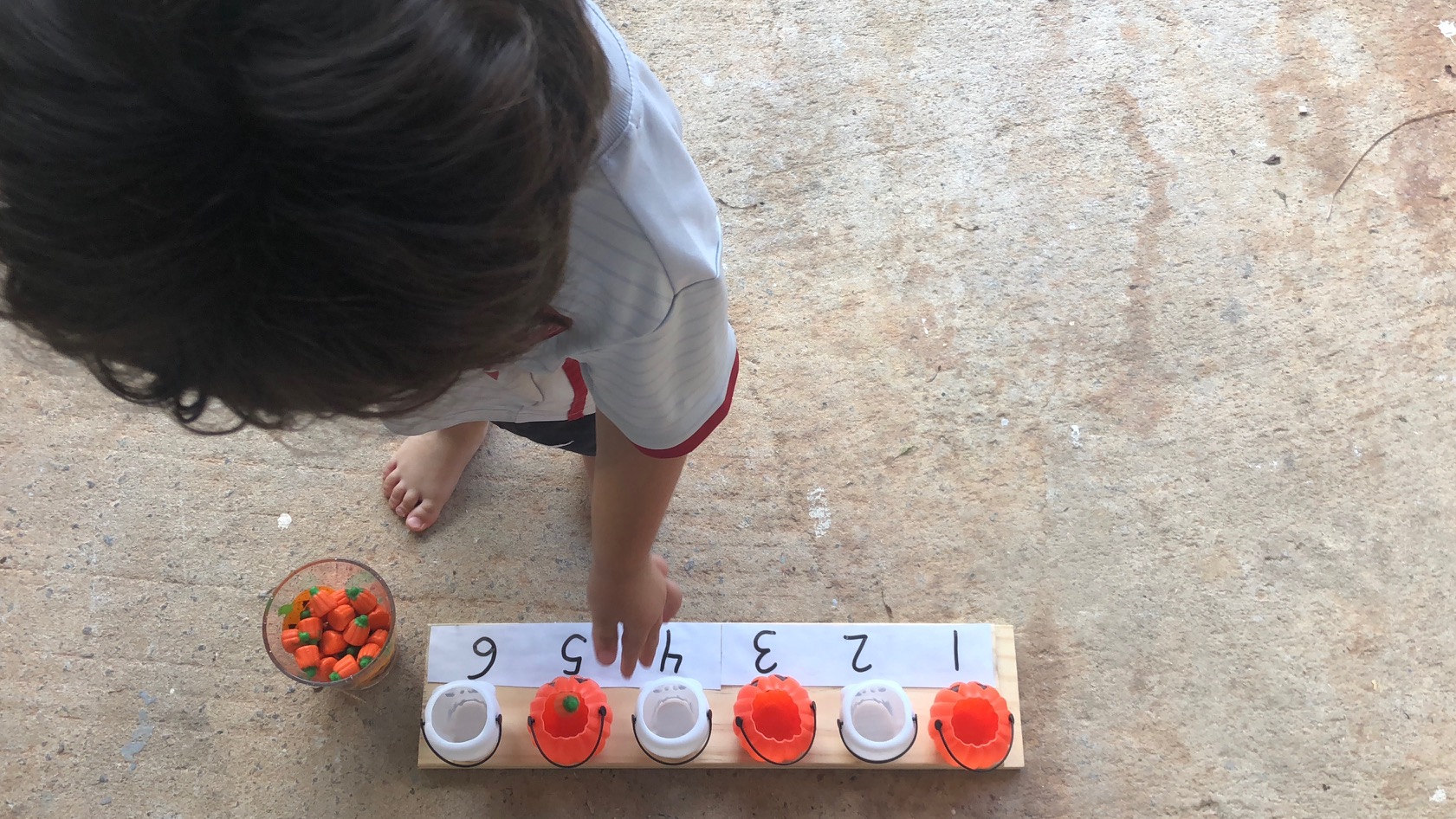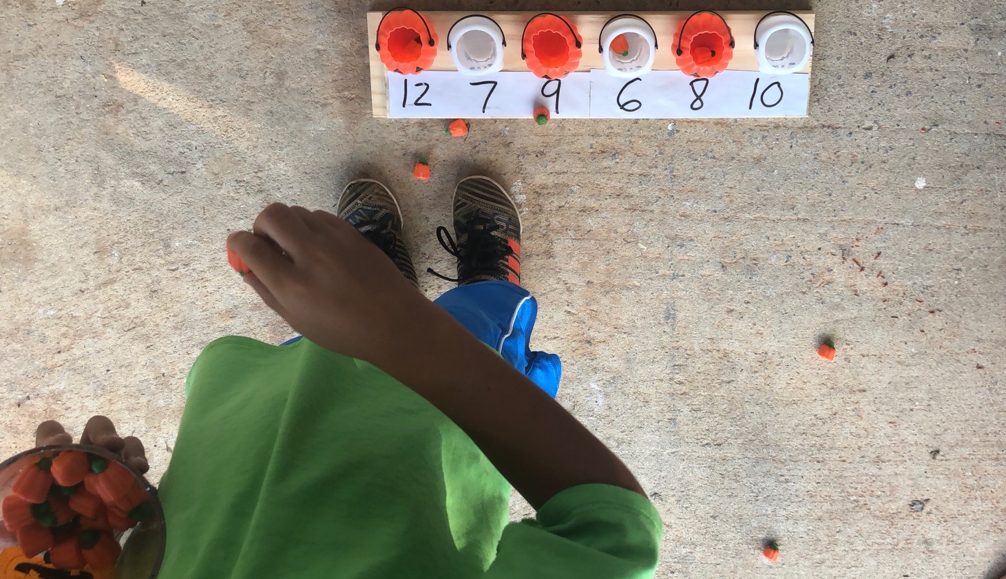 Now you are ready to play! Write letters, numbers, name, words or shapes in front of the mini Halloween buckets. Toss or drop the pumpkin candies into mini Halloween buckets.