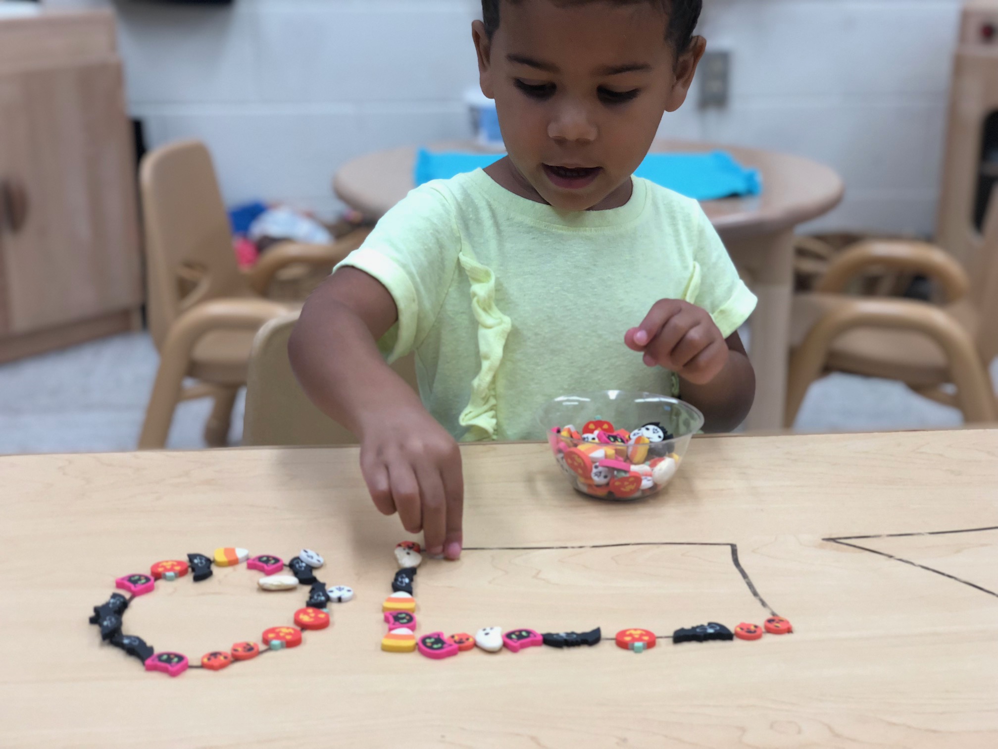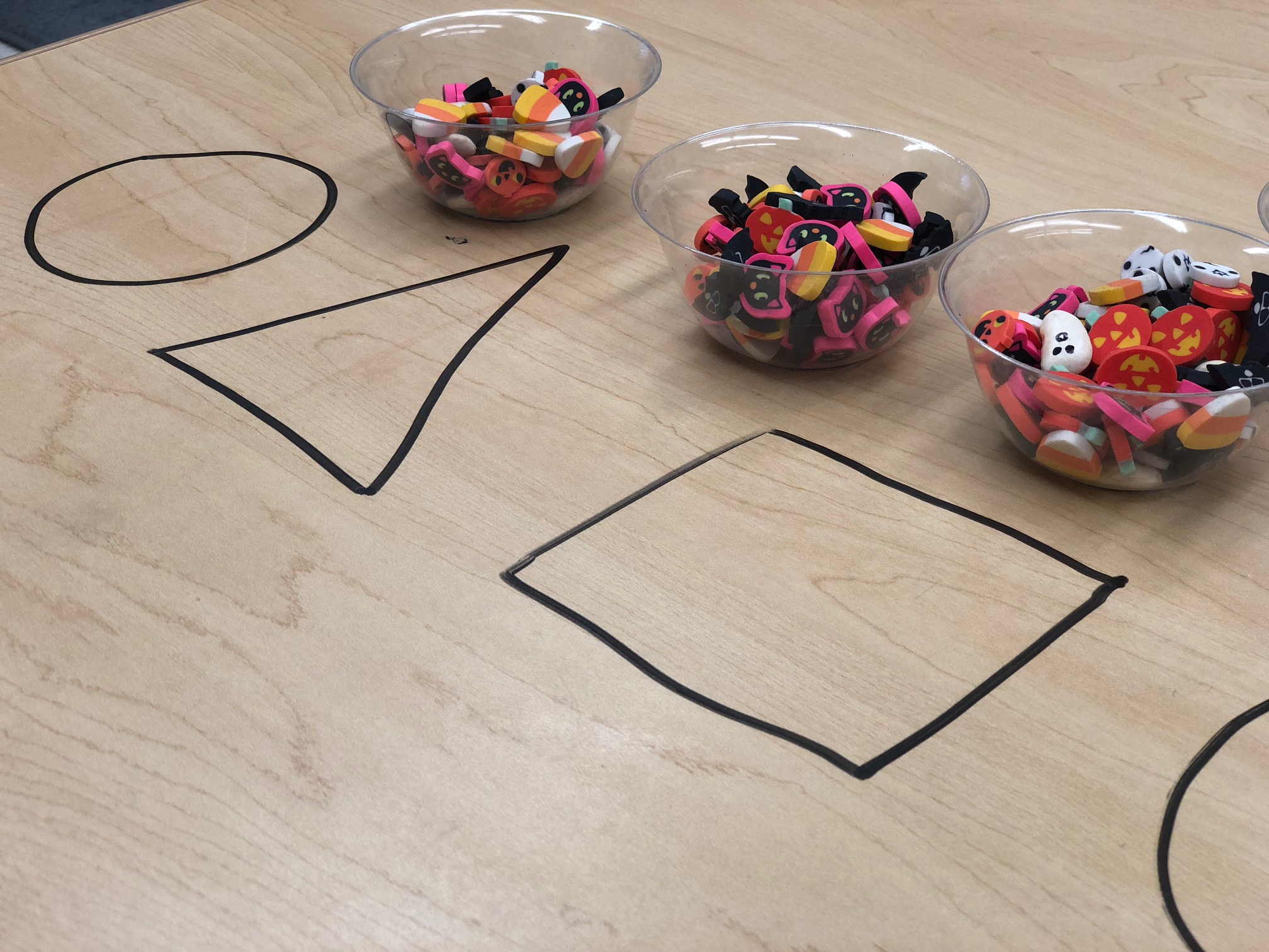 Fun way to talk about shapes. Can you make a pattern? How many erasers did you use to cover the shape? What shape are you covering?