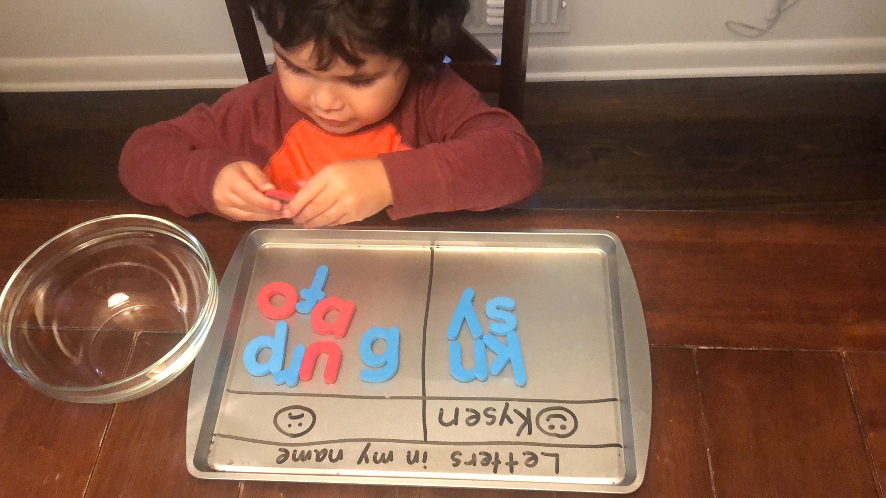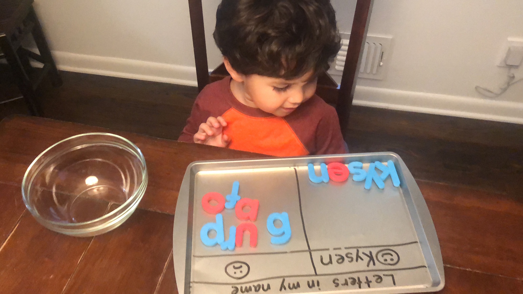 Put some magnet letters in a bowl. Have your child sort through the letters. Letters in my name and letters not in my name.
