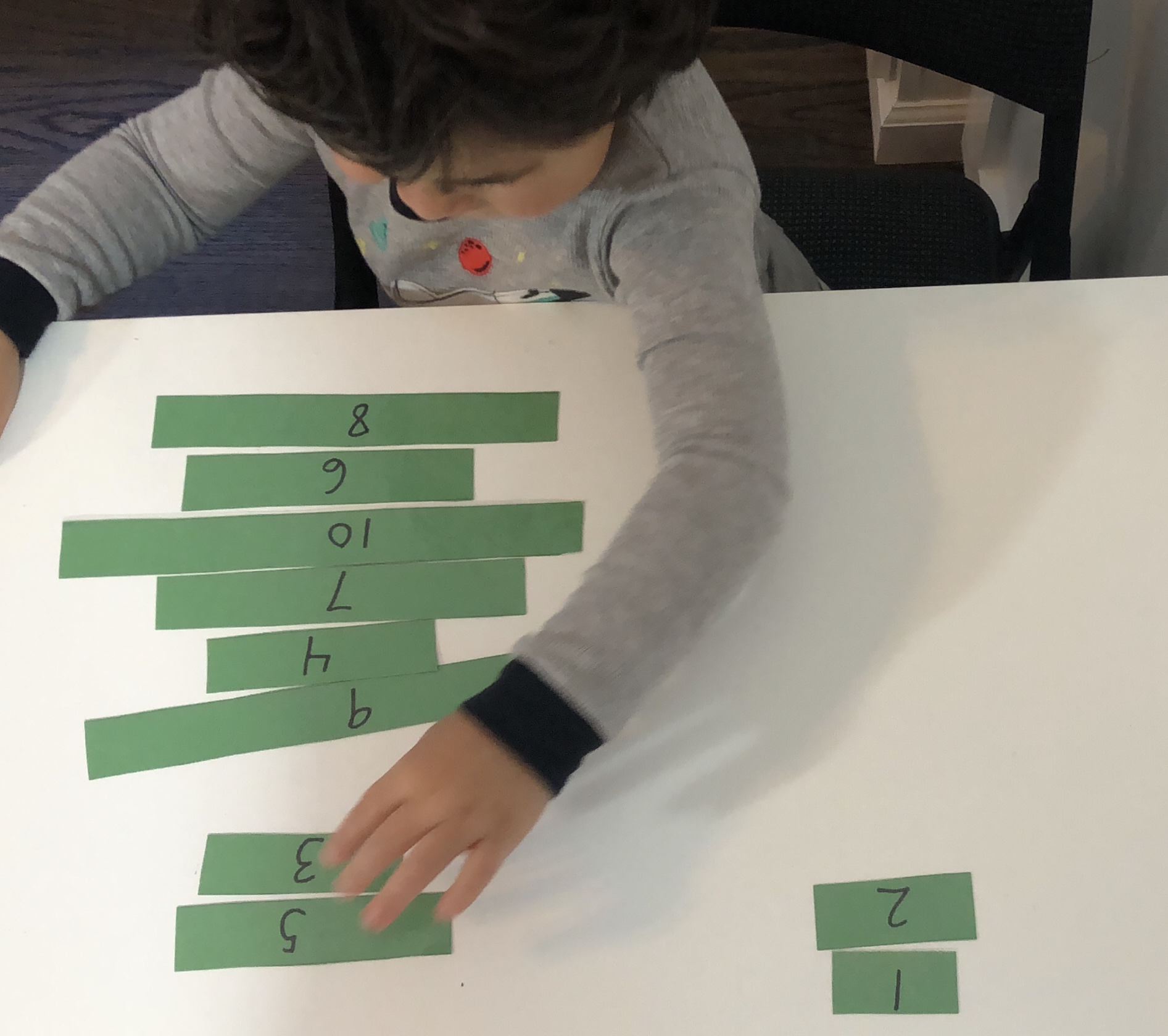 First you have to cut your green paper into 10 different size strips. Then write the numbers 1-10 on one side of them.