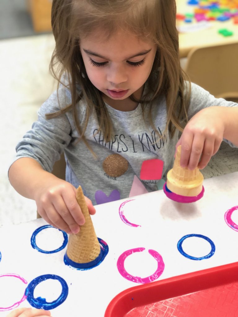 We have been talking about ice cream in my class recently. We decided to try painting with ice cream cones! Print painting allows kids to try out different techniques and to see the cause and effect in action. Kids love trying to paint with different art mediums.