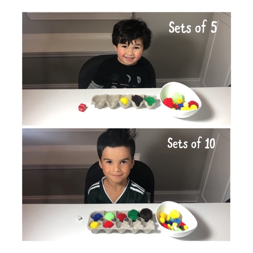 If you are working on sets of 5 you need a dice with numbers 0-5. Cut an egg carton to have 5 slots. Roll the dice and fill the egg carton with pom poms to match the number you roll. Then count how many empty spaces there are. Add the number of pom poms and the number of empty spaces to make 5. Before we start I always have the kids count how many empty spaces their are so they can get an understanding that we are working with sets of 5.