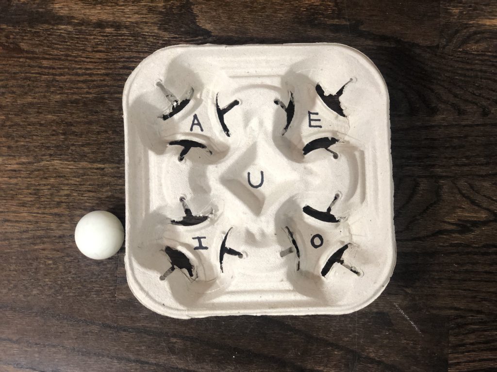 To make this game all you need is a marker, take out coffee carrier and a ping pong ball. Write the Vowels on the coffee carrier.