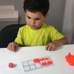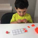 Have the child roll the dice again keeping the play dough balls on the ten frame. In the pictures below Kysen first rolled a 2. He made 2 play dough balls on his ten frame. When he rolled again he got a 5. I asked him if he could make the 2 into 5. This tells me he can count up from the number 2. As the child continues to roll have them count up or down to the new number they roll.
