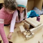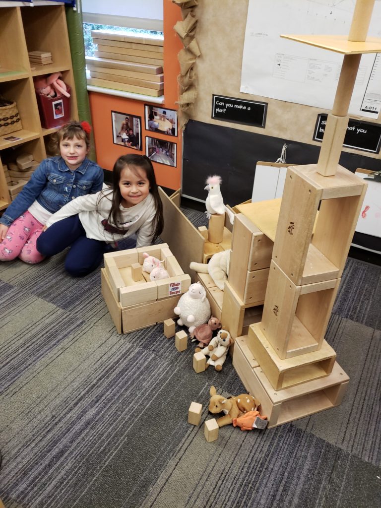 After the first building challenge, our class reflected on what worked and what didn’t. What problems did we have? What worked well? What was missing? What was hard? What could we do better? We used those reflections to improve our first structures. What made a good structure? We wove in vocabulary – floor, wall, level, roof, entrance. We completed another challenge in different small groups. We used smaller blocks (Kapla blocks) and smaller animals. Each time the children built a structure, we heard new vocabulary being used, and “aha” moments like “these two blocks equal one of these big blocks.” Learning was happening.