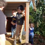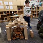In small groups, we had a building challenge. Can you build a structure for a large stuffed tiger or bear using just items found in the room? As collaboration and imaginations collided, it didn’t take much time before we had amazing structures built out of blocks, furniture, blankets and napping mats. And we heard inquisitive conversations – how can we make this wall longer? Why won’t the roof stay? How would the animal get out? Our students were learning from their imagination!