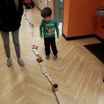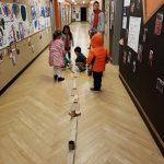 How could we measure it? The list the class generated of ways to measure the trail was amazing. We could line the entire trail with children. We could use a tape measure. We could use string. The most exciting idea was…. let’s measure the trail with blocks! Of course – blocks! Our favorite thing! Before loading an entire class set of unit blocks into our bus and heading to the park, we thought we would do a trial run and measure the hallway with blocks. The kids loved this! Every child was so excited to grab blocks from our block center