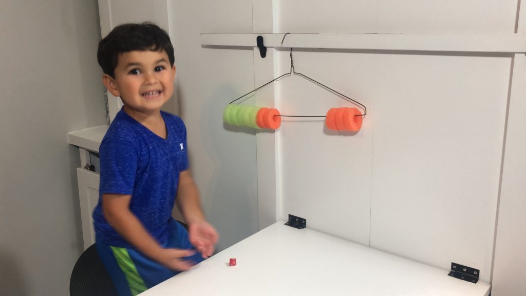 Next grab a dice and you are ready to play. Kysen would roll the dice. Then he would call out what number he rolled. He rolled a 9, so he moved 9 pool noodles to the right. Then he counted how many were left. He was able to tell me 9 and 1 make 10. Then he rolled again!