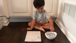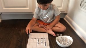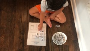 Kysen has been really into mazes, so we created this maze board to go with some bottle caps. The challenge was to begin at the start square and make your way down to the finish square. When he was done we counted how many bottle caps it took him to get to the bottom. He also loved making different designs on the maze board.