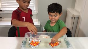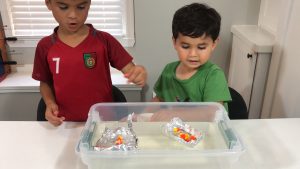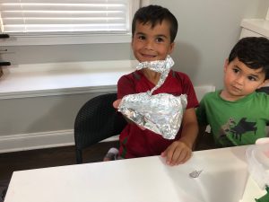 Then we made boats out of foil. The boys guessed the boats would hold more candy corns since they had sides and the water wouldn’t get in the boat as fast.