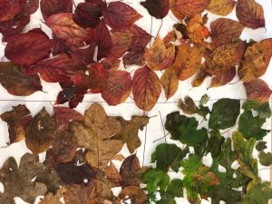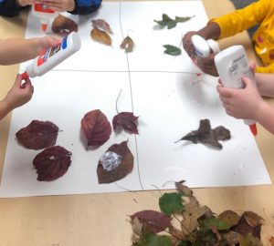 Lay the leaves on a table and let them start gluing and sorting the leaves by color.