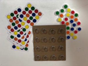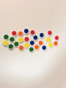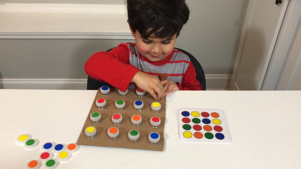 Next put the Dot Labels on the bottle tops. You will need at least 4 of each color (red, blue, green, orange, yellow). Then print out the cards and you are ready to go.