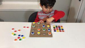 This activity is great for fine motor and spatial reasoning skills. Strong spatial reasoning skills in preschool help support math learning in elementary school. Great way to talk about colors and positions of colors in relation to each other.