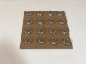 First cut the tops off of the bottles and hot glue them to a piece of cardboard.