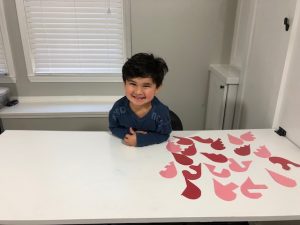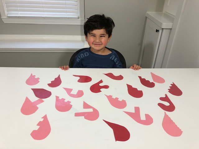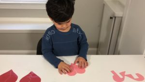 These DIY heart puzzles were so easy to make! Just cut out some hearts with construction paper. Make a design down the middle and cut 2 halves. Then laminate them so they last longer. Puzzles are a great way to work on fine motors, problem solving skills and visual spatial awareness. Kysen enjoyed the challenge of putting all the heart puzzles together.