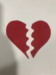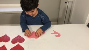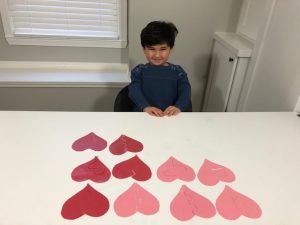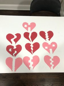 Cut hearts out of construction paper. Then draw a design down the middle and cut the heart in half. We made 10 different designs. I like to laminate the pieces so they last longer.