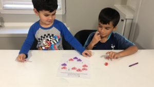 Kids take turns rolling the dice. Once they roll they color in a heart that matches the quantity of dots they rolled. If they roll a 5 and all the 5’s are colored in then the dice goes to the next player.
