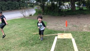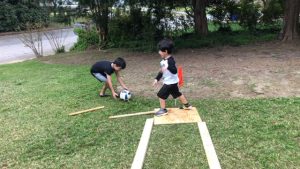 This was a challenge for the boys. They had to work together carrying the ball with the sticks to the end of the course. If the ball dropped they had to go back to the start. They were working on teamwork, communication, balance, coordination and gross motor skills. This was a fun way for them to practice accomplishing a goal together. They didn’t get it right away but when they did accomplish the goal they were so excited and proud!