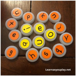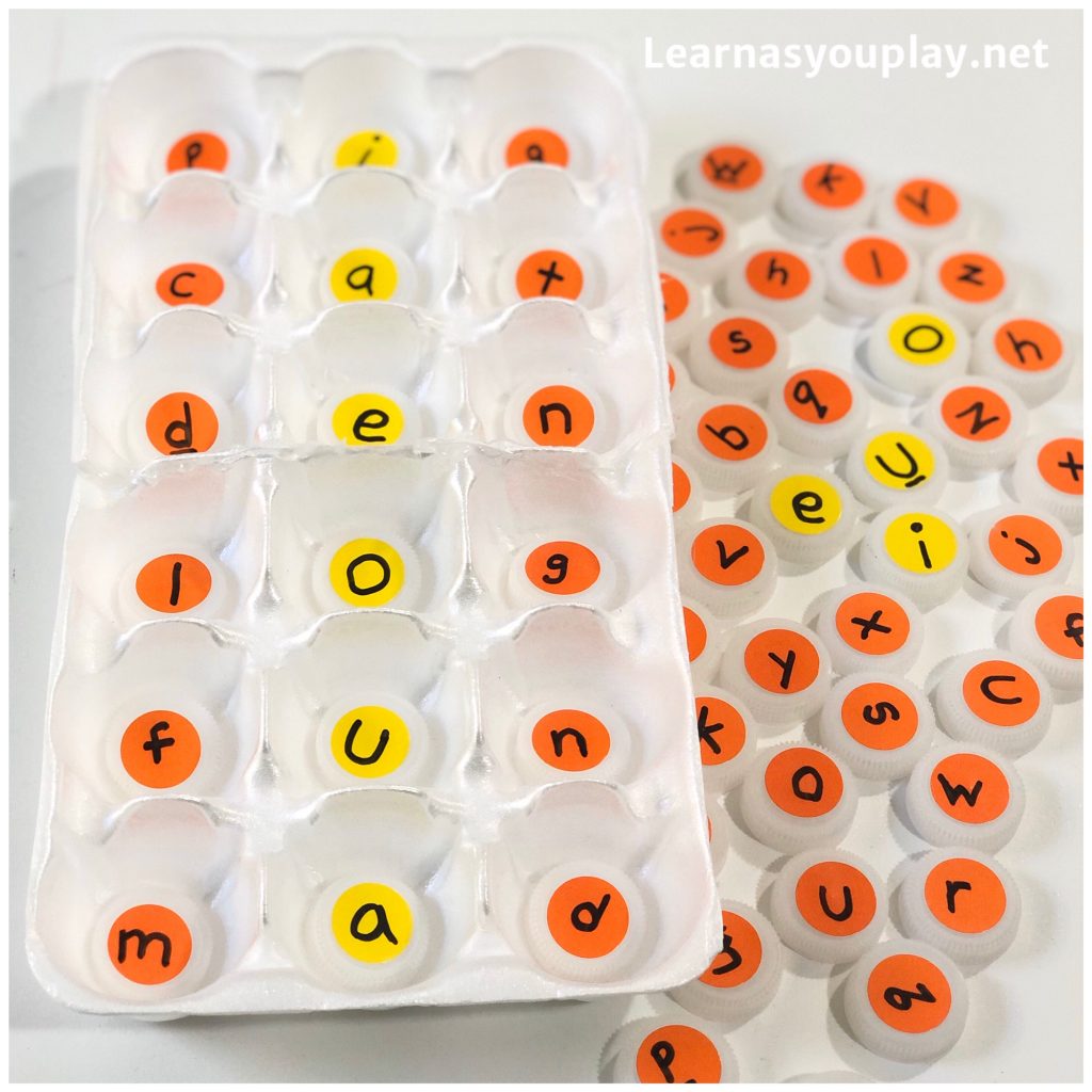 Grab a 18 egg carton. Have the child place the yellow letters (vowels) in the middle. Then have them place the orange letters (consonants) on the outsides. Once they have places the letters. Have them sound out the word. If they need help sound out the words together.