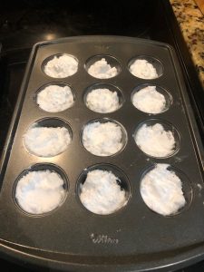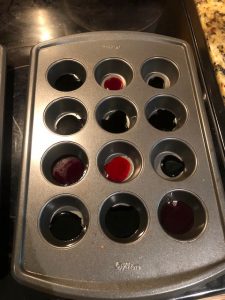 First put food coloring in the muffin tins. We did 5 drops in each. Then cover the food coloring with baking soda.