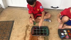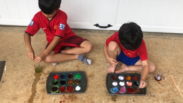 Fill a baby food jar or cup with vinegar. Then give your child a pipette and let them have fun playing! What happens when you mix baking soda and vinegar? The boys were surprised to see the different colors!