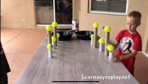 The first race was 5 balls and 5 paper towel tubes.