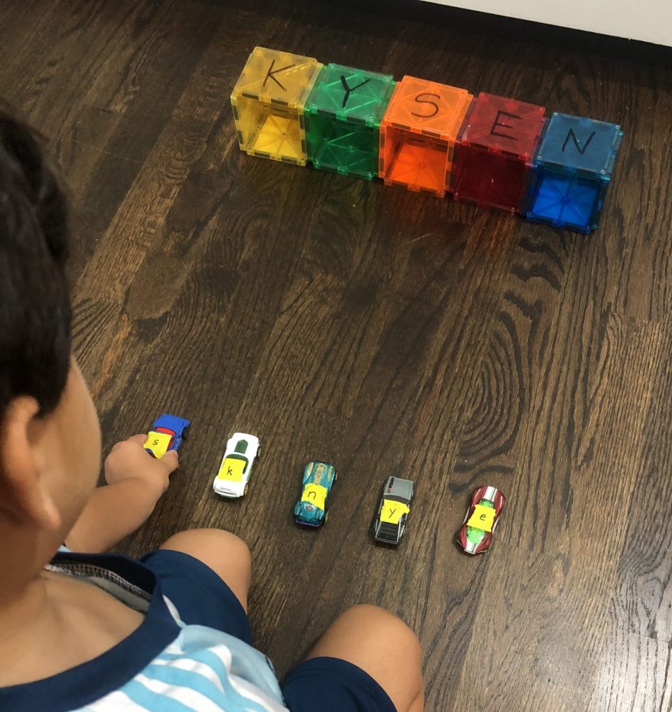 Kysen loves building with magnetic builders so he made the boxes! Then I wrote the letters of his name with uppercase letters using a dry erase marker. Looking back I should have let him write the letters. Next time!