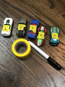 Next I wrote the letters of his name using lower case letters and we taped them on his cars.