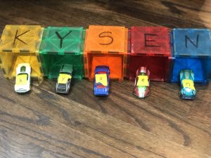 This was a fun way to work on name recognition, letter recognition and matching uppercase and lowercase letters. Kysen has always loved playing with cars. He still lines them up to race! Did you know you can write on Magnetic builders with dry erase markers!