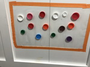 So simple and fun! All you need is some contact paper, tape and some recycled lids! This is a great sensory activity for little ones!