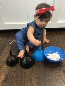 Devyn loved playing with these loose parts! It took her little to figure out how to get the Q-tips in the funnels but once she did there was no stopping her! This is a great activity for fine motors, critical thinking and problem solving.