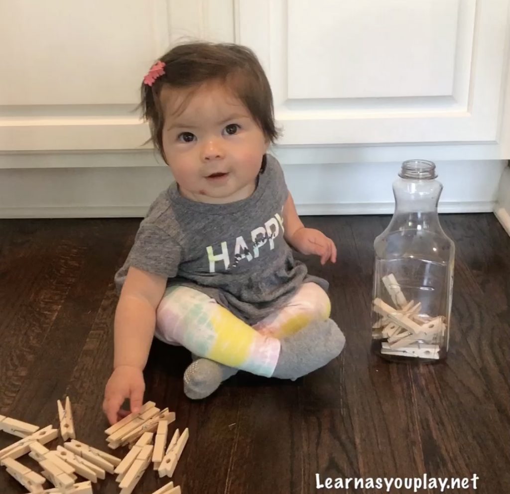 So simple and so fun! Devyn loved exploring with these materials. This was a great fine motor activity. She also had to use her problem solving and critical thinking skills getting the clothespins in and out of the container. You can see in the video she was very proud of her accomplishments along the way!