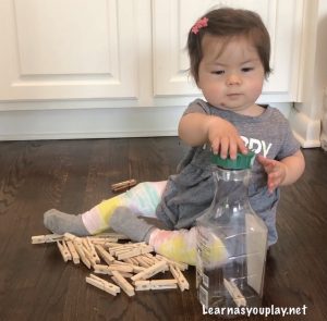 Devyn really enjoyed playing with these materials. Fist she loved just putting the clothespins into the container. Then she realized she could turn the container over and shake the clothespins out. After doing that a couple of times, she enjoyed putting clothespins in the container and then putting the lid on over and over!