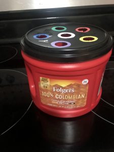First you use the box cutter to cut cut holes in the top of the coffee canister.