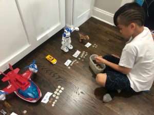 Jalen has been working on counting with coins for his home learning. He loved this game. He wrote price tags for his toys. Then he