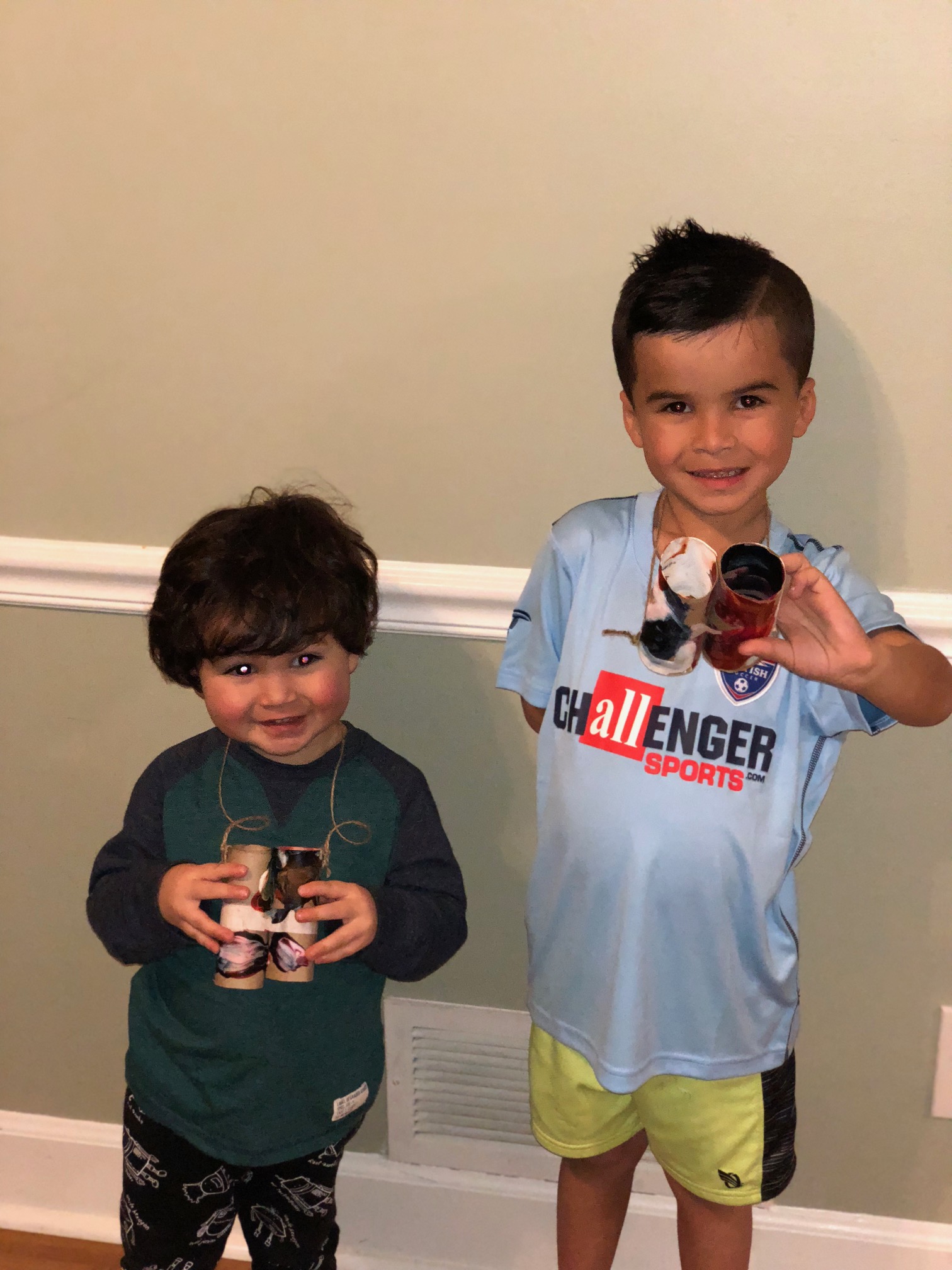 Toilet Paper Roll Binoculars Toilet Paper Roll Binoculars! Tape two toilet paper rolls together and then paint. When they dry punch a hole on each