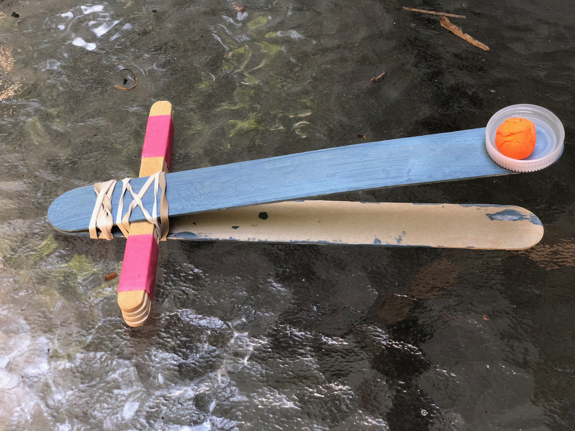 The boys loved the Popsicle Stick Catapult! Materials 2 large popsicle sticks 4 popsicle sticks tape 2 rubberbands plastic bottle top (I have seen people