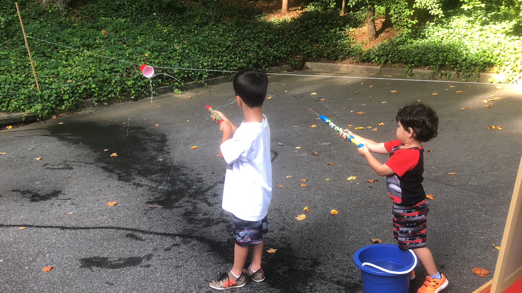 This was a fun water activity. Originally the boys were going to race with two strings, but it was hard for my just turned 3