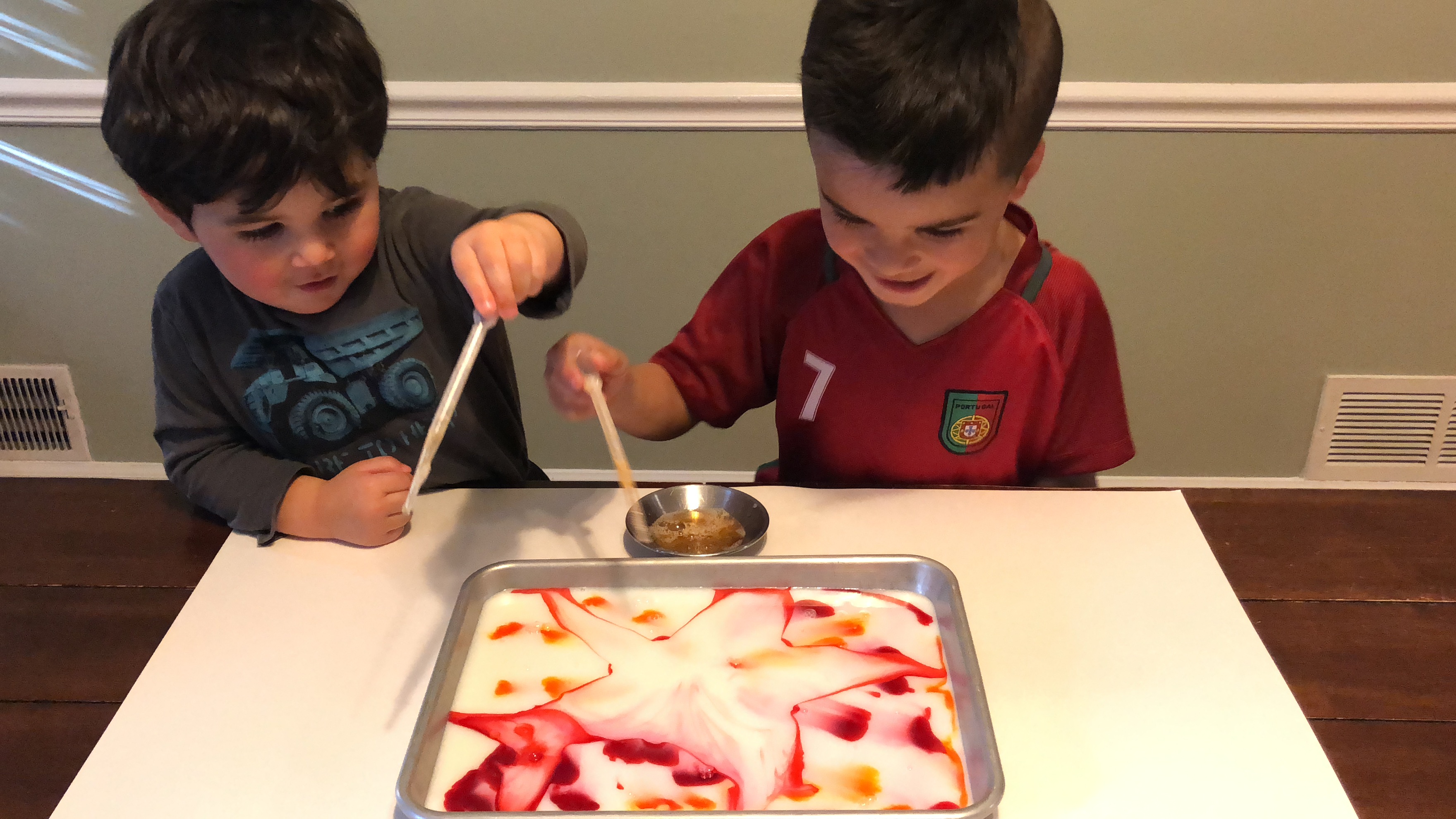Watch the magic happen with this color changing experiment! Materials needed: Milk Food Coloring Q-tips Cotton Balls Pipettes Dish Soap (I used Dawn dish soap