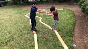 This was a challenge for the boys. They had to work together carrying the ball with the sticks to the end of the course. If