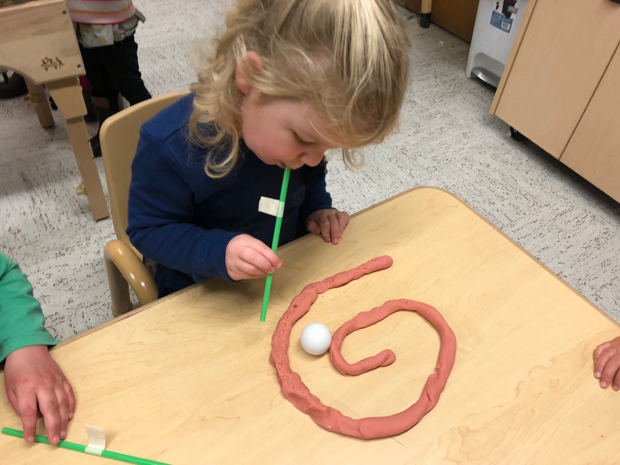 Play dough mazes! All you need for this activity is play dough, a ping pong ball and a straw. First the kids had to roll