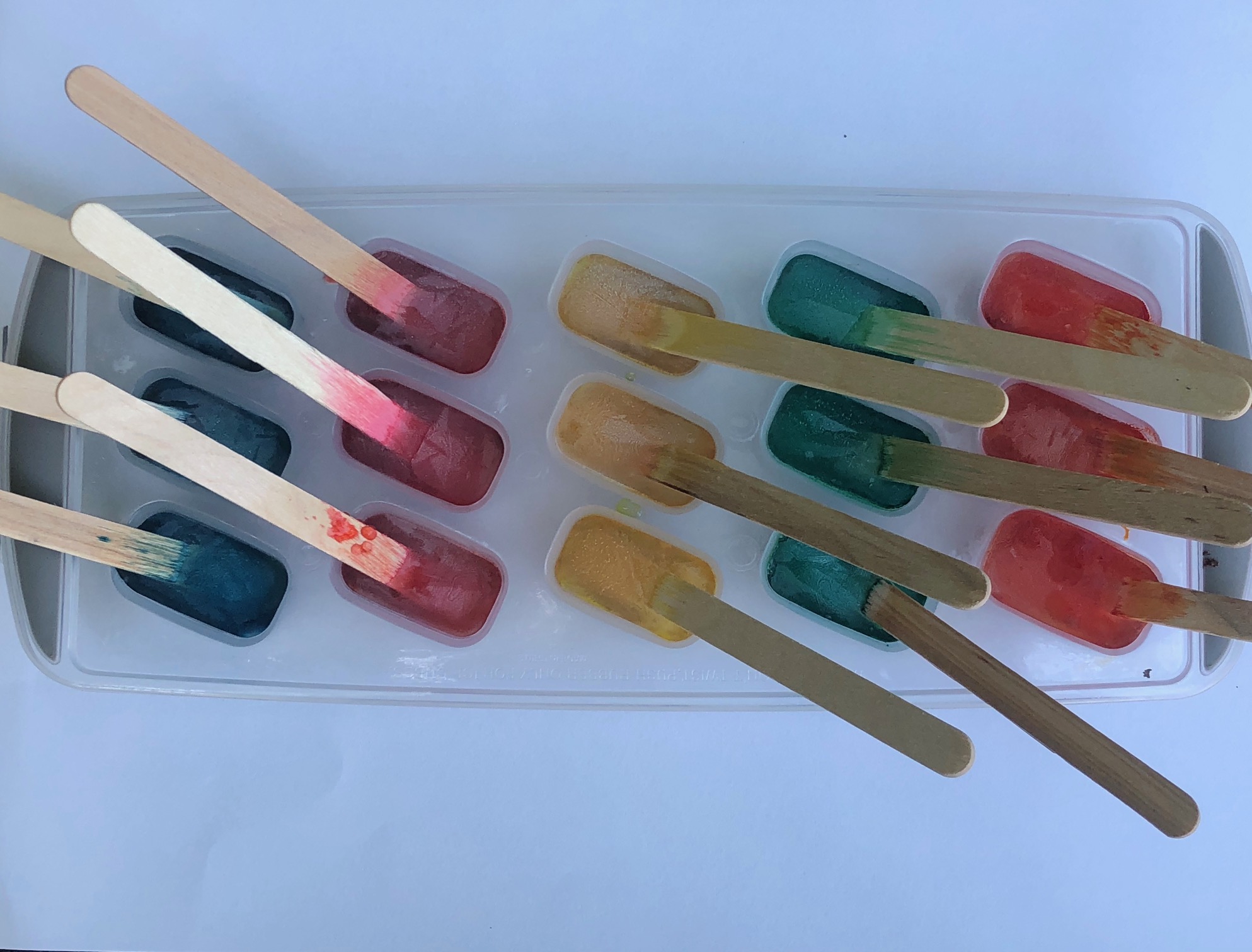 This is a great process art, sensory and fine motor activity! Especially on a hot summer day! Materials(affiliate links): Ice Tray Water Food coloring Popsicle