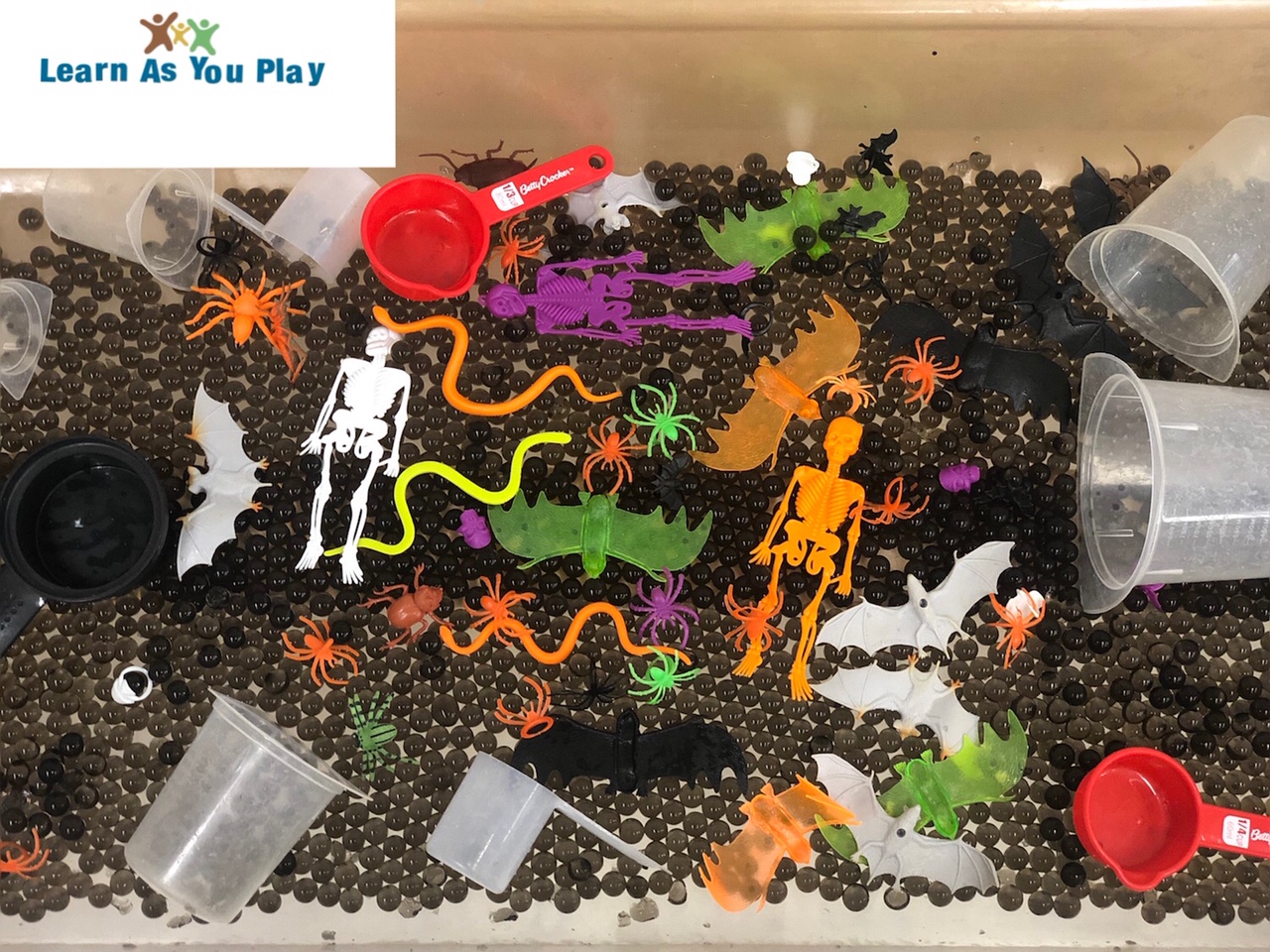Fun Halloween theme sensory bin! Materials (affiliate link) : Black Water Beads Halloween Toys First you have to soak the water beads in water. Kids